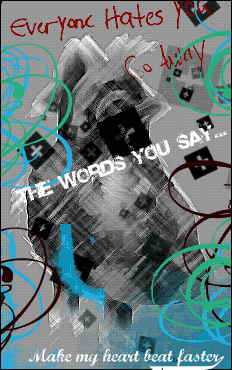 James Blunt- great blending! but what's with that white mark on his yellow shirt? Steezy- I would like it better if the font is blue. Cell division- Very nice! "this will be the end" should be a different font, IMO. Far- it's slightly choppy but I like the background. Circles- I like the colors. Bright Blue- Nice color! So Sick- I like the tone this picture gives me. Purely Simple- Good job! I really like it. But it isn't "pure" enough to call it "purely simple." Abstract Randomness- I think you should colorize it. How Quickly I Forgot- different font please... Saying Goodbye- I would rather want it to be more opaque. And no swirls please! Cameron Diaz Colorization- since I don't like the original already, all I can say is that she looks very pale and the hair color is not natural enough. But it's good for your first. Silverstein- I like the pencil outline. Utada Hikaru- the skin is way better...but did you draw in the eyebrows? City Sleeps in Flames- Nice effect. Tall Building- I like the effect as well. The Note Home- the font for "The Note Home" doesn't match...and also the blood. Kirby Star Power- Simple, but cute. Feather and Tear- I really like it!!! But I still want to see a matching font. Honestly, I can see that you improved a lot. |